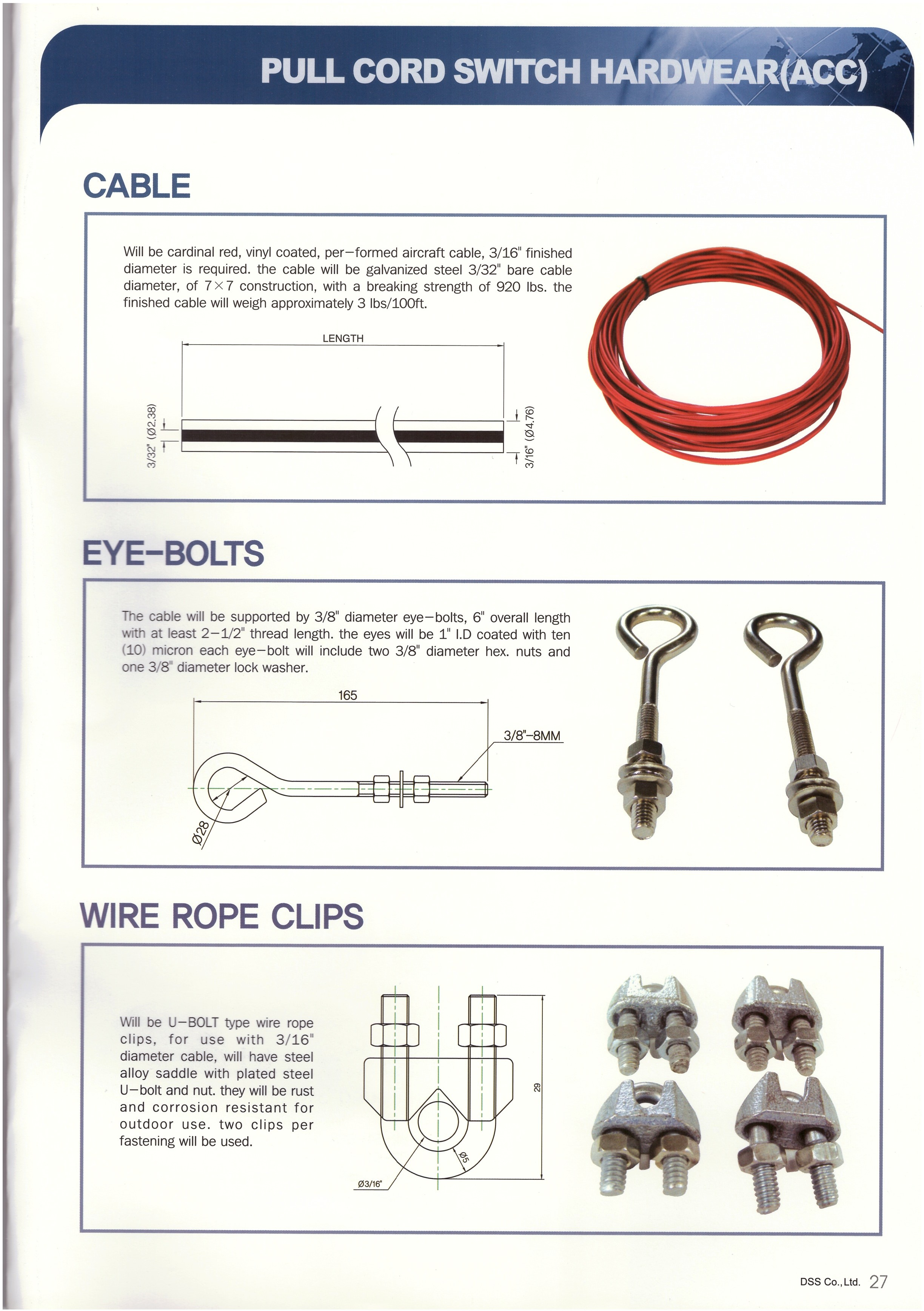 PULL CORD SWITCH ACC PULL CORD WIRE : 4.7 RED COATED EYE BOLT : 8MM WIRE CLIP : 3/16 INCH